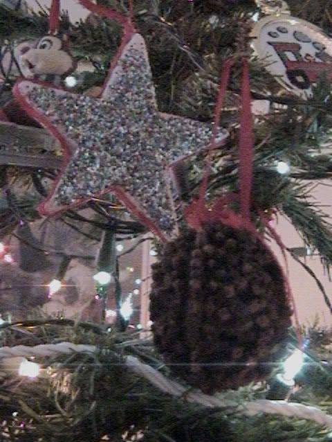 These ornaments are 13 years old in this photo.  ( again sorry for the quality of the photo) They were made by my oldest son when he was 3. The stars are simple. Just a form, glue, glitter, and ribbon. With care they have lasted all these years and make the tree sparkle.