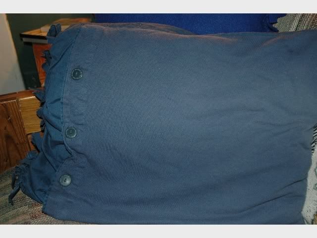 This pillow was recovered using a portion of a duvet that was to be tossed out. ( go here if you do not know what a duvet is! http://en.wikipedia.org/wiki/Duvet ) The buttons were part of the duvet. I did not have to do button holes or sew on the buttons!