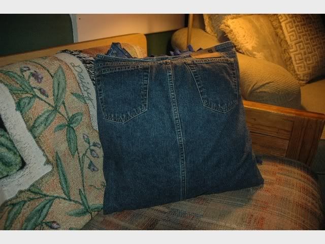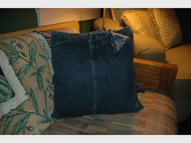 Maybe my favorite so far this season...a pillow cover made out of a jean skirt. We get so many junior size jean skirts in the clothing closet. It seems size 7 is a popular size. So this pillow ( above ) is a jr size 7!