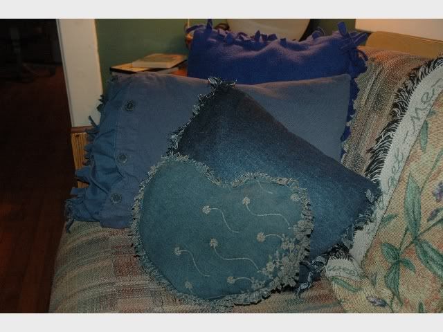 This heart shaped pillow was free. The new cover is made from a cast away pair of demin shorts. ( wait till you see what I am going to do with the front side of the shorts!)