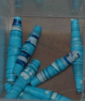 I have been working on making beads. These photos show the beads unfinished. I have to wait on warm weather so I can lacquer the beads. Once coated with a few coats of lacquer they will have a hard finish. Then each bead will be hand decorated. The cost of the beads so far is zero.  They are made of paper from discarded magazines I get from our library. I have been collecting stuff to decorate them with for a long time. The only cost will be the findings for necklaces and earrings.